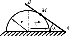 Тело 1, имеющее форму полуцилиндра, скользит по горизонтальной плоскости со скоростью v = 0,2 м/с, поворачивая шарнирно закрепленный в точке А стержень АВ. Определить относительную скорость точки касания М, если угол α = 30°. Ответ округлить до тысячных.