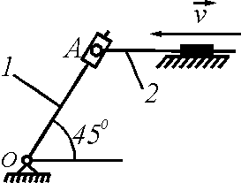 Стержень 2 кулисного механизма движется со скоростью v = 1 м/с. Для указанного положения механизма определить угловую скорость кулисы 1, если расстояние ОА = 1 м. Ответ округлить до тысячных.