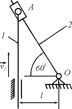 Стержень 1 кулисного механизма движется вверх со скоростью v1 = 2 м/с. Для заданного положения механизма определить угловую скорость кулисы 2, если расстояние l = 40 см. Ответ округлить до сотых.