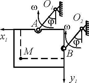 Пластина приводится в движение двумя кривошипами АO1 = ВO2 = 1 м, вращающимися с постоянной угловой скоростью ω = 2π. По пластине движется точка М согласно уравнениям x1 = 0,2t3 и y1 = 0,3t2. Определить абсолютное ускорение точки М в момент времени t = 1 с, если угол φ = 30°. Ответ округлить до десятых.
