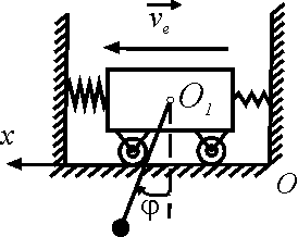 Тележка движется со скоростью vе = sin(π/3)t. Стержень О1М длиной 1 м, закрепленный в центре тележки, движется по закону φ = 0,5 πt. Определить абсолютное ускорение конца стержня (точки М) в момент времени t = 0,5 с. Ответ округлить до сотых.