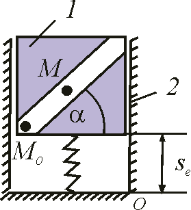 Тело 1 движется в вертикальной цилиндрической трубе 2 по закону se = 1 + 0,3 sin(π/3)t. Шарик М движется по каналу внутри тела 1 по закону МoМ = 0,1 е3. Определить абсолютное ускорение шарика в момент времени t = 0,5 с, если известен угол α = 45°. Ответ округлить до тысячных. |