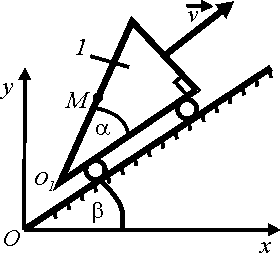 Тело 1 движется по наклонной плоскости равномерно со скоростью v = 2 м/с. Точка М относительно тела 1 движется согласно уравнению O1M = 0,5t. Определить координату точки М в момент времени t = 1 с, если при t = 0 хM = 0, α = β = 30°. Ответ округлить до сотых. |