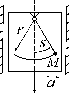 Точка М маятника движется по окружности радиуса r = 0,1 м согласно уравнению s = 0,01 sin10 t в лифте, опускающемся с постоянным ускорением а = 0,1 м/с2. Определить модуль абсолютного ускорения точки М в момент времени, когда координата s = 0.
