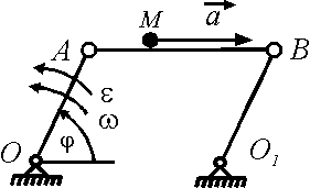 По стержню АВ шарнирного параллелограмма ОАВО1 движется точка М с ускорением а = 0,4 м/с2. Определить модуль абсолютного ускорения точки М в момент времени, когда угол φ = 0,5π, угловая скорость стержня ОА длиной 0,1 м равна ω = 4 рад/с, а угловое ускорение ε = 0,4 рад/с2. Ответ округлить до сотых.