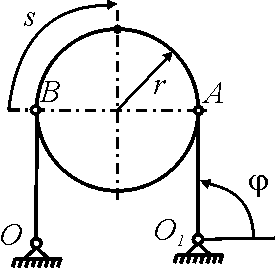 Звено О1А вращается согласно уравнению φ = 2t. По ободу диска радиуса r = 0,5 м движется точка М по закону s = 2r t. Определить модуль абсолютного ускорения точки М в момент времени t = 0,25π. |