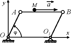 По стержню АВ шарнирного параллелограмма ОАВО1 движется точка М с ускорением а = соs t. Стержень ОА длиной 2 м вращается согласно уравнению φ = t. Определить модуль абсолютного ускорения точки М в момент времени t = π. |