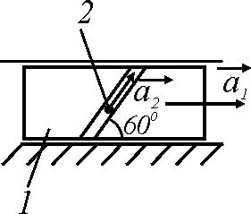 Ползун 1 движется по горизонтальным направляющим с постоянным ускорением a1 = 4 м/с2. Точка 2 перемещается по отношению к ползуну с ускорением а2 = 3 м/с2. Определить абсолютное ускорение точки. Ответ округлить до сотых.