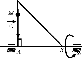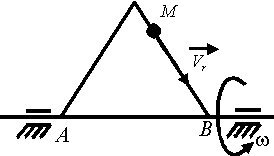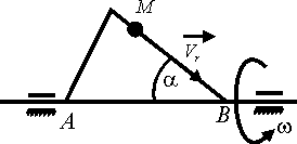 По стороне треугольника, вращающегося вокруг стороны АВ с угловой скоростью ω = 4 рад /с, движется точка М с относительной скоростью vr = 2 м/с. Определить модуль ускорения Кориолиса точки М, если угол α = 30°. |