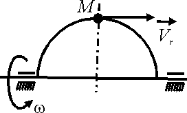 По ободу полукруга, вращающегося вокруг диаметра с угловой скоростью ω = 4 рад/с, движется точка М с относительной скоростью