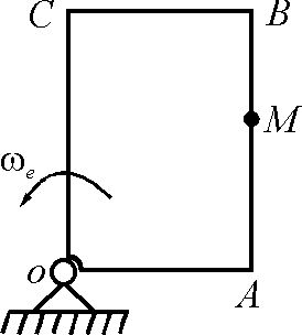 По стороне АВ прямоугольной пластины, вращающейся в плоскости чертежа, движется точка М по закону АМ = 3 sin (π/3)t. Определить угловую скорость пластины ωе в момент времени t = 2 с, если ускорение Кориолиса в точке М в этот момент равно 4 π м/с2. |