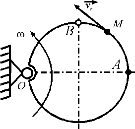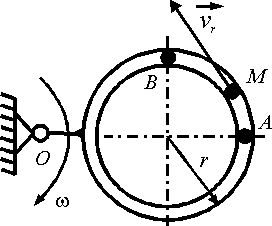 По кольцу радиуса r = 0,5 м, вращающемуся в плоскости чертежа вокруг оси О c угловой скоростью ω = const, движется точка М со скоростью vr = const. Изменится ли модуль ускорения Кориолиса точки М при переходе ее из А в B ? |