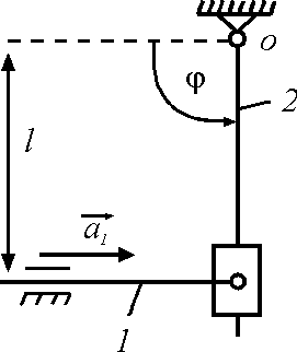 Стержень 1 кулисного механизма движется с постоянным ускорением а1 = 2 м/с2. Определить угловое ускорение кулисы 2 в данном положении механизма, если угол φ = 90° и расстояние l = 0,5 м. |
