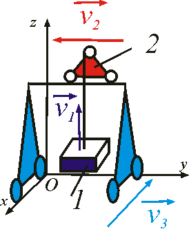 Подъем груза 1 осуществляется со скоростью v1 = 0,4 м/с. Тележка 2 козлового крана движется со скоростью v2 = 0,3 м/с, а скорость крана v3 = 0,2 м/с. Определить абсолютную скорость груза 1. Ответ округлить до тысячных.