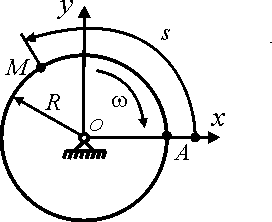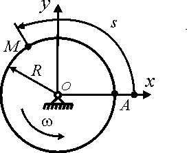 Точка М движется по диску радиуса R = 0,5 м согласно уравнению АМ = 2t2. Диск вращается с постоянной угловой скоростью ω = 2 рад/с. Определить дуговую координату s точки М в момент времени t = 0,5 с, если в начальный момент точка находилась на оси Ох. |