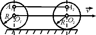 Спаренные колеса движутся со скоростью v = 36 км/ч. Определить абсолютную скорость коромысла А1А2 в момент времени, когда отрезки O1А1 = O2А2 = 0,2 м вертикальны. Радиус R = 0,25 м. |