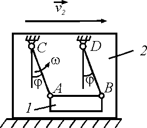 Тело 1 с помощью стержней АС = ВD = 3 м шарнирно присоединено к телу 2. Определить абсолютную скорость тела 1 в момент времени, когда тело 2 движется со скоростью v2 = 10 м/с, угол φ = 45φ и угловая скорость стержней ω = 1,5 рад/с. Ответ округлить до десятых.