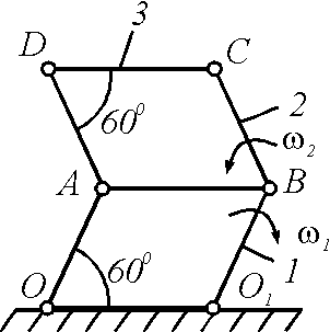 Определить модуль скорости поступательного движения звена 3 в указанном положении механизма, если звенья 1 и 2 длиной 0,5 м вращаются с абсолютными угловыми скоростями ω1 = ω2 = 2 рад/с. Фигуры ОАВО1 и АСDВ являются параллелограммами.