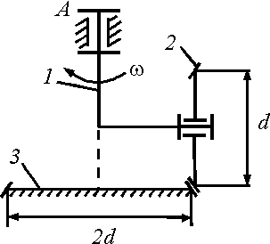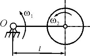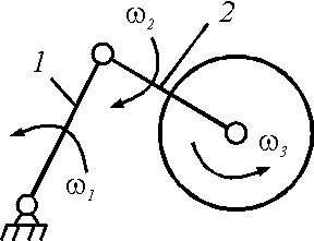 В плоском механизме диск вращается относительно стержня 2 с угловой скоростью ω3 = 2 рад/с, а стержень 2 относительно стержня 1 – с угловой скоростью ω2 = 4 рад/с. При какой угловой скорости ω1 стержня 1 абсолютное движение диска будет поступательным?