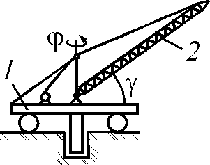 Основание 1 подъемного крана поворачивается согласно уравнению φ = 0,2t. Угловая скорость подъема стрелы 2 равна d ω/d t = 0,3 рад/с. Определить модуль абсолютной угловой скорости стрелы. Ответ округлить до тысячных.