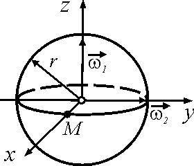 Сферическая оболочка радиуса r = 0,5 м участвует одновременно в двух вращательных движениях с угловыми скоростями ω1 = 3 рад/с и ω2 = 4 рад/с. Определить модуль скорости точки М оболочки в изображённом положении. Ответ округлить до десятых.