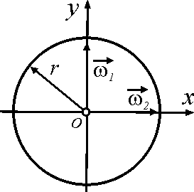 Диск радиуса r = 0,6 м участвует одновременно в двух вращательных движениях с угловыми скоростями ω1 = 3 рад/с и ω2 = 4 рад/с. Определить модуль скорости той точки диска, для которой этот модуль имеет максимальное значение. |