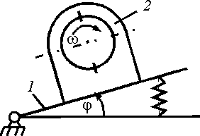 Платформа 1 совершает колебания по закону φ = 0,1 sin 10 πt. Якорь 2 двигателя вращается относительно статора с угловой скоростью ω = 7 рад/с. Определить максимальное значение абсолютной угловой скорости якоря. Ответ округлить до десятых.