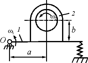 Платформа 1, совершая колебательное движение, имеет угловую скорость ω1. Якорь 2 двигателя вращается относительно статора с угловой скоростью ω2 = ω1. Определить расстояние в см от мгновенной оси вращения якоря до точки О, если а = 40 см, b = 30 см.