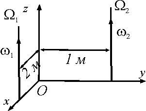 Тело участвует в двух вращательных движениях вокруг параллельных осей Ω1 и Ω2 с угловыми скоростями ω1 = 1 рад/с, ω2 = 3 рад/с. Определить модуль абсолютной скорости точки О тела. Ответ округлить до сотых.
