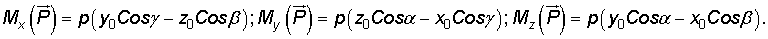 П р и м е р 1. Сила величиной р и образующая с осями координат углы α, β и γ , приложена в точке с координатами (x0, y0, z0). Найти моменты силы относительно осей координат.