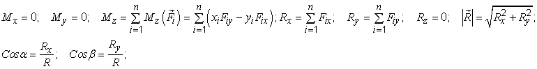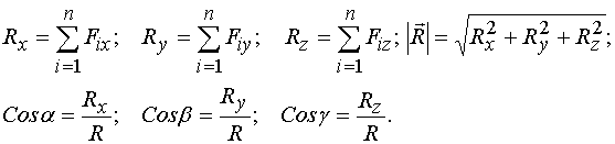 Главный вектор R геометрически выражается замыкающей силового многоугольника. Проекции, величина и направляющие косинусы главного вектора определяются соотношениями