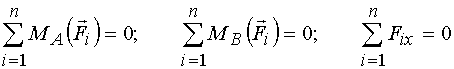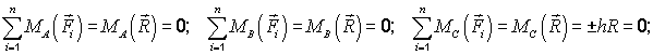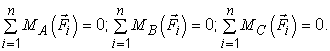Для равновесия плоской системы сил, приложенной к твёрдому телу, необходимо и достаточно, чтобы сумма алгебраических моментов сил системы относительно трёх любых точек, расположенных в плоскости действия сил и не лежащих на одной прямой, равнялась нулю, то есть: