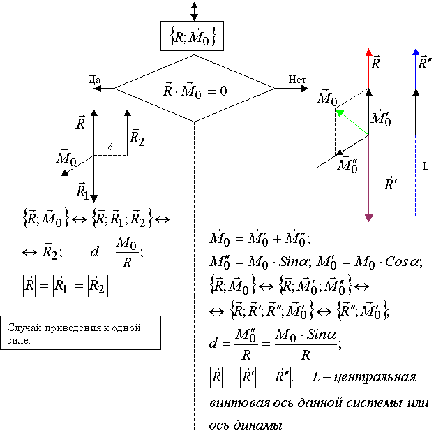- R ≠ 0; M0 ≠ 0; R·M0 = 0 – система приводится к равнодействующей.