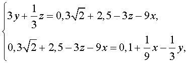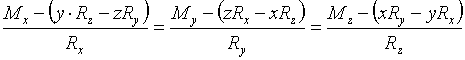 > eq2:=(M[2,1]-(z*R[1,1]-x*R[3,1]))/R[2,1]-(M[3,1]-(x*R[2,1]-y*R[1,1]))/R[3,1]=0;#уравнения 1 и 2 определяют систему оси динамы