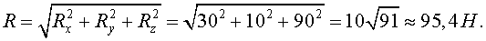 Р е ш е н и е. Находим проекции главного вектора на оси координат: Rx = P1 = 30 H; Ry = P4 = 10 H; Rz = - P2 - P3 = - 40 - 50 = - 90 H.