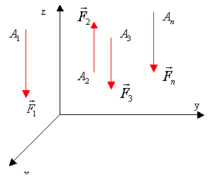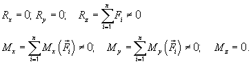 динаме, можно привести к равнодействующей силе, паре сил или эта система будет находиться в равновесии.При равновесии пространственной системы параллельных сил необходимо и достаточно, чтобы алгебраическая сумма проекций всех сил на ось, параллельную линиям действия сил, равнялась нулю и чтобы алгебраическая сумма моментов всех сил относительно каждой из двух координатных осей, не параллельных линиям действия сил, также равнялась нулю.