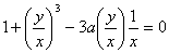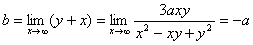 | 1977. | x ³ + y ³ - 3axy = 0 декартов лист (см. задачу 366). Особая точка 0 (0; 0) – узел с касательными y = 0 и x = 0. Найдём асимптоту y = kx + b. Приведём уравнение к виду ; отсюда . Итак, y = - x - a – асимптота Нажми на линк для просмотра рисунка |