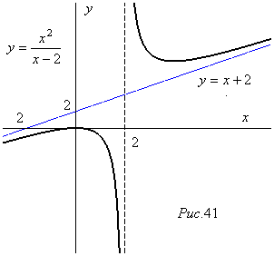| 1197. | При х = 0 ymax = 0, при х = 2 у = ± ∞, при х = 4 ymin = 8; асимптоты х = 2 и у = х+2 (рис.41). |