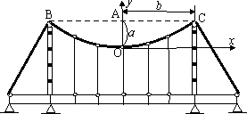 2074. Нагрузка на канат висячего моста (с. 33, рис. 6) от каждой единицы длины горизонтальной балки равна р (Н). Пренебрегая весом каната, найти его форму , если натяжение каната в низшей точке принять за H (Н).