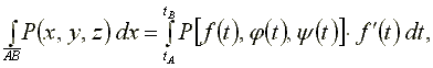 2° Вычисление криволинейного интеграла . Пусть кривая <AB> задана уравнением х = f (x), y = j (x), z = ψ (x), а параметр t при перемещении точки М(t) по дуге <AB> в одном направлении изменяется монотонно; тогда
