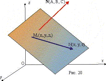 Пусть М (x, y, z) произвольная точка плоскости (рис. 20). Тогда M1M ^ N и по условию перпендикулярности векторов