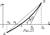 3° Способ хорд приближённого решения уравнения f (x) = 0. Пусть α 0 тот из концов отрезка [a, b], отделяющего корень, на котором f (α 0)·f ″ (α 0) < 0. Тогда приближением к корню х будет точка α 1 пересечения с Ох хорды АВ (рис. 23):