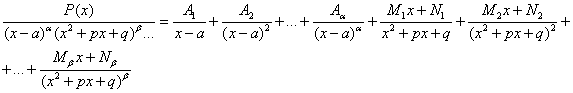 2°. Знаменатель правильной дроби разлагается на множители вида ( х - а )α и ( х² + px + q )β, а правильная дробь разлагается на сумму элементарных дробей следующим образом: