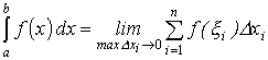 называется интегральной суммой, а ее предел при max Δ xi → 0, если он существует и конечен, называется определенным интегралом от функции f (x) в пределах от а до b и обозначается: