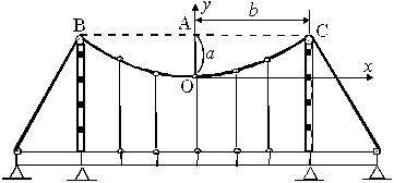 215. Канат подвесного моста имеет форму параболы (рис.6). Написать ее уравнение относительно указанных на чертеже осей, если прогиб каната OA = а, а длина BC = 2b.