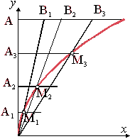223. Даны точки А (0; а) и В (а; а). Отрезки ОА и АВ разделены на n равных частей точками А1, А2, А3, и В1, В2, В3, (рис7). Пусть Mk -точка пересечения луча ОВk с прямой АkМk || Ох. Показать, что такие точки Мk лежат на параболе у2 = ах.