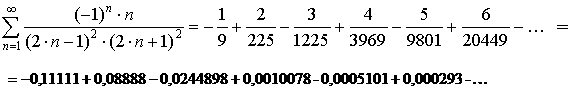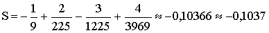 Так как уже пятое слагаемое этого знакочередующего ряда меньше по абсолютной величине установленной точности α = 0,001, то достаточно взять первые четыре члена ряда, чтобы вычислить сумму с заданной точностью.