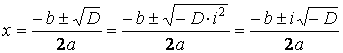 в случае, когда дискриминант этого уравнения D = b2 - 4 ac < 0. В этом случае действительных корней нет. Однако, и вэтом случае корни квадратного уравнения есть, только они не действительные, а комплексные. В этом случае можно поступить так