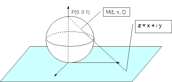 Дополняя соответствие, установленное стереографической проекцией (3) и (4), сопоставление полюсу Р сферы точки z = ∞, получим взаимно однозначное соответствие между сферой и расширенной комплексной плоскостью. Следовательно, каждую точку сферы можно рассматривать как изображение соответствующей точки расширенной комплексной плоскости.