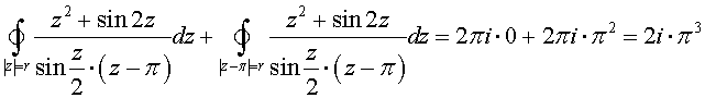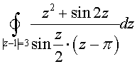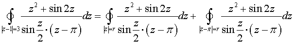 .Решение. Подинтегральная функция имеет разрывы в точках z =2 n·π, z = π. Подинтегральная функция является аналитичной в трёхсвязанной области, предсталяющей собой круг с границей | z - 1 | = 3, из которого вырезаны два круга | z | < r и | z - π | < r, где r > 0 – достаточно малая величина. Следовательно